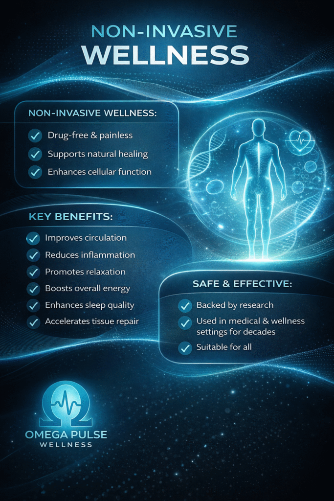 Pulsed Electromagnetic Field (PEMF) therapy is a non-invasive, drug-free wellness approach, that uses low-frequency electromagnetic waves to stimulate and support the body’s natural healing processes. By delivering gentle, pulsating magnetic fields to targeted areas, PEMF therapy enhances cellular function, improves circulation, reduces inflammation, and promotes relaxation. It’s designed to boost overall well-being, alleviate discomfort, and support recovery from various physical stressors.